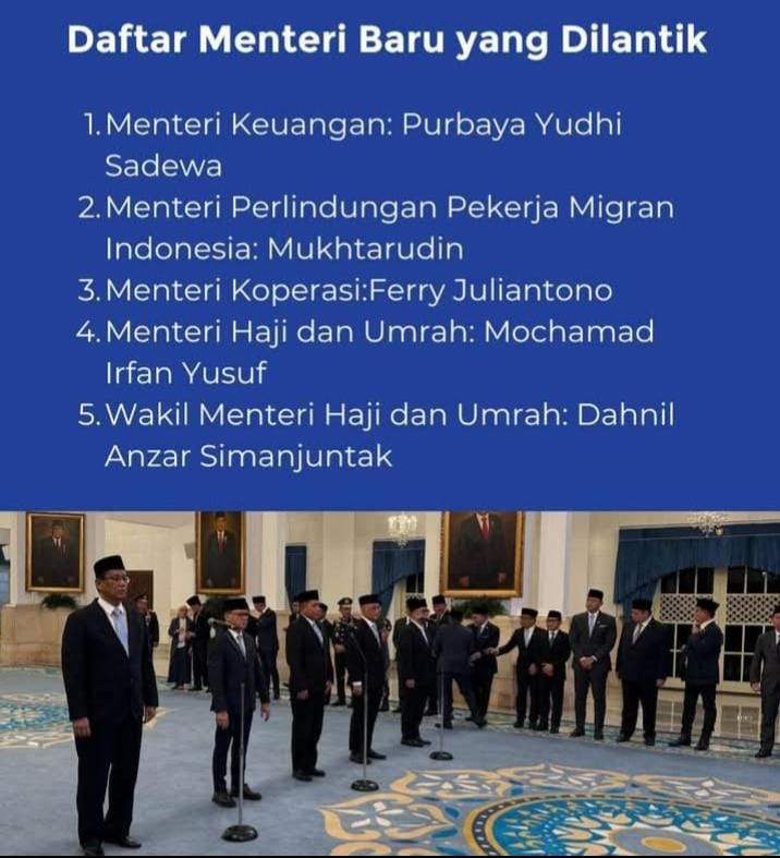1. Kementerian Keuangan yang dipimpin oleh Sri Mulyani, diganti oleh Purbaya Yudhi Sadewa
