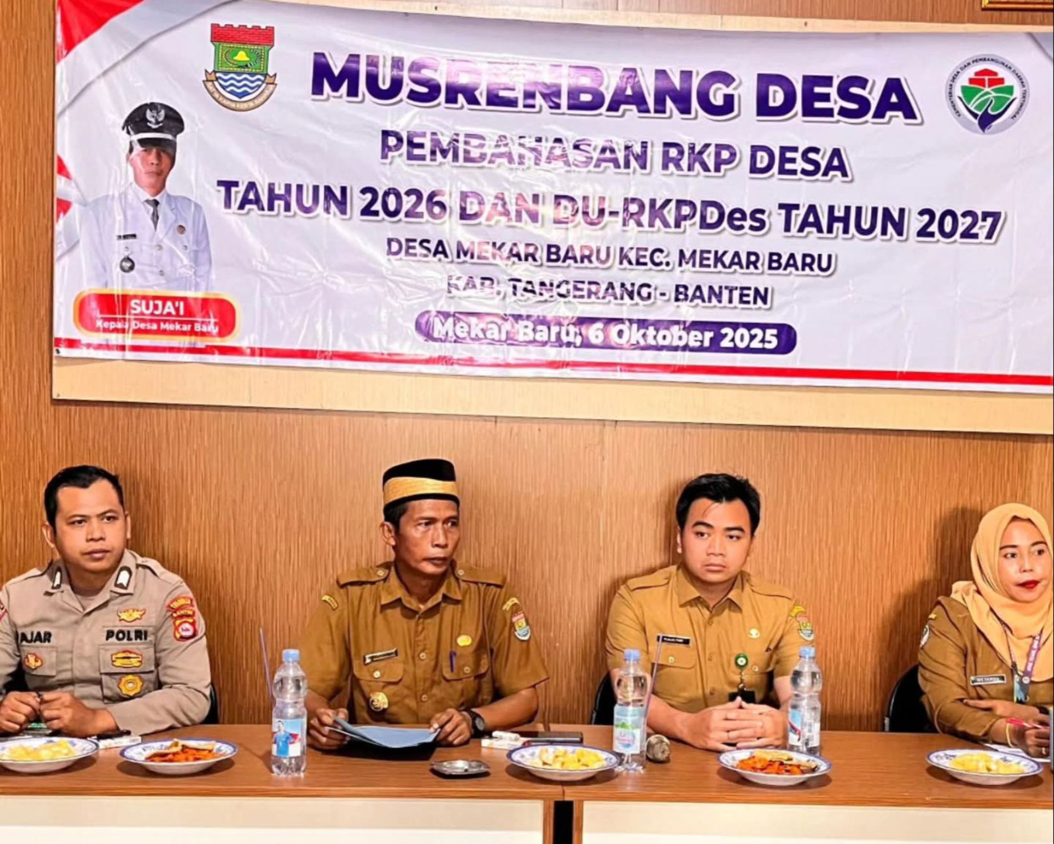 KABUPATEN TANGERANG— Pemerintah Desa Mekar Baru menggelar Musyawarah Perencanaan Pembangunan Desa (Musrenbangdes) tahun 2026 yang berlangsung di aula Desa Mekar Baru, Kecamatan Mekar Baru, pada Senin (6/10/2025). Kegiatan ini bertujuan untuk membahas rencana pembangunan tahun 2026 sekaligus menjaring berbagai usulan prioritas pembangunan untuk tahun 2027.