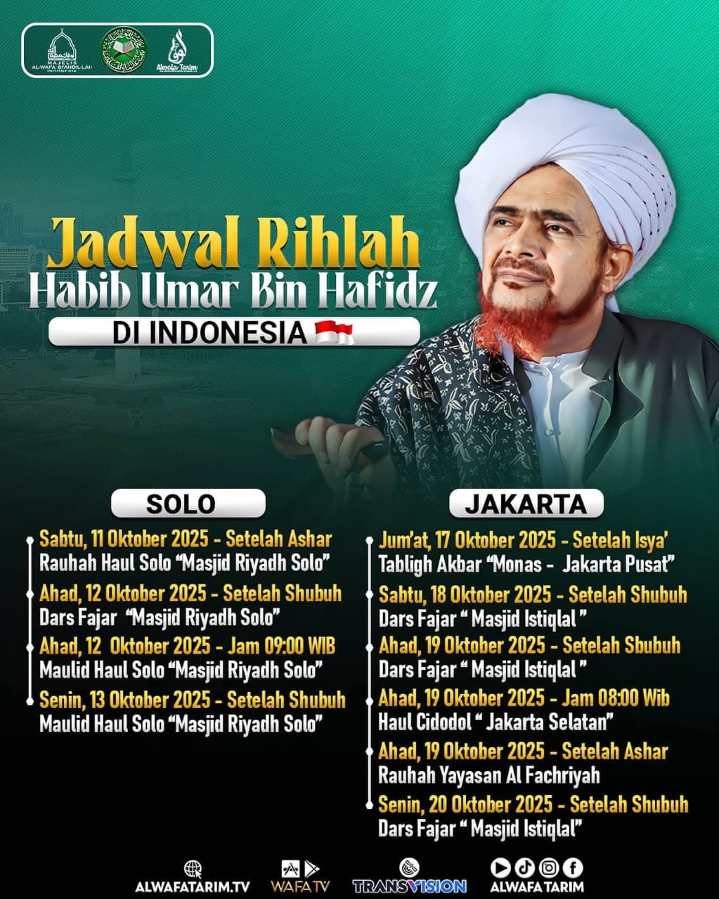 Informasi resmi mengenai jadwal dakwah Habib Umar dirilis melalui akun Instagram @alwafatarimtv. Berikut rangkaian lengkap kegiatan beliau selama berada di Indonesia.